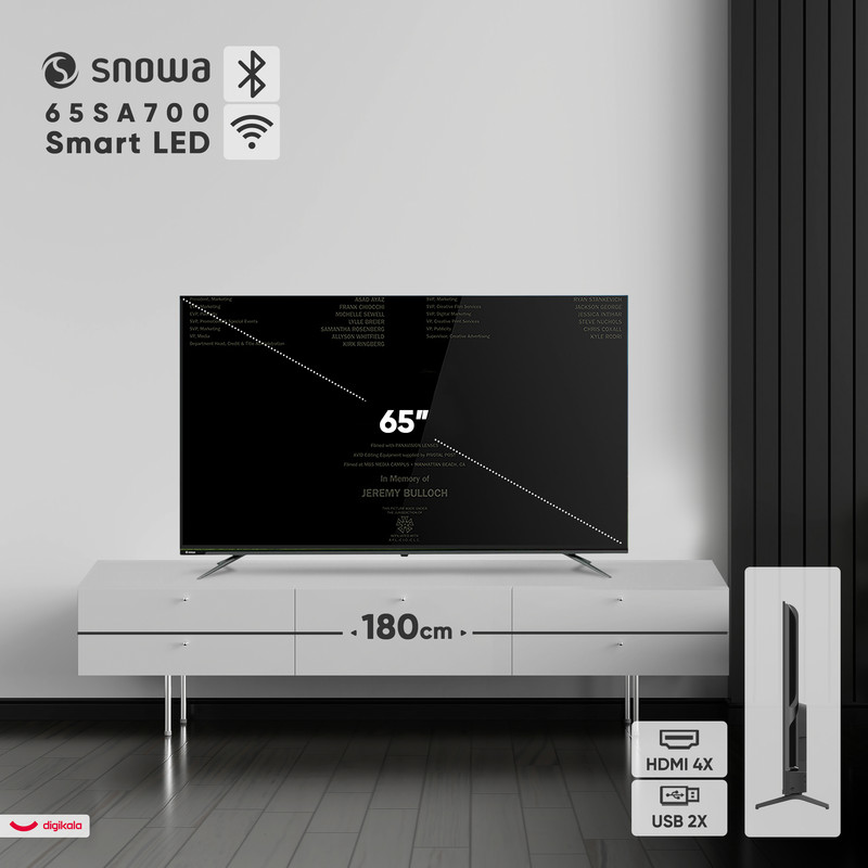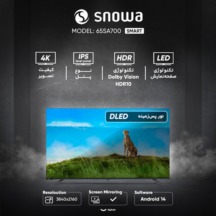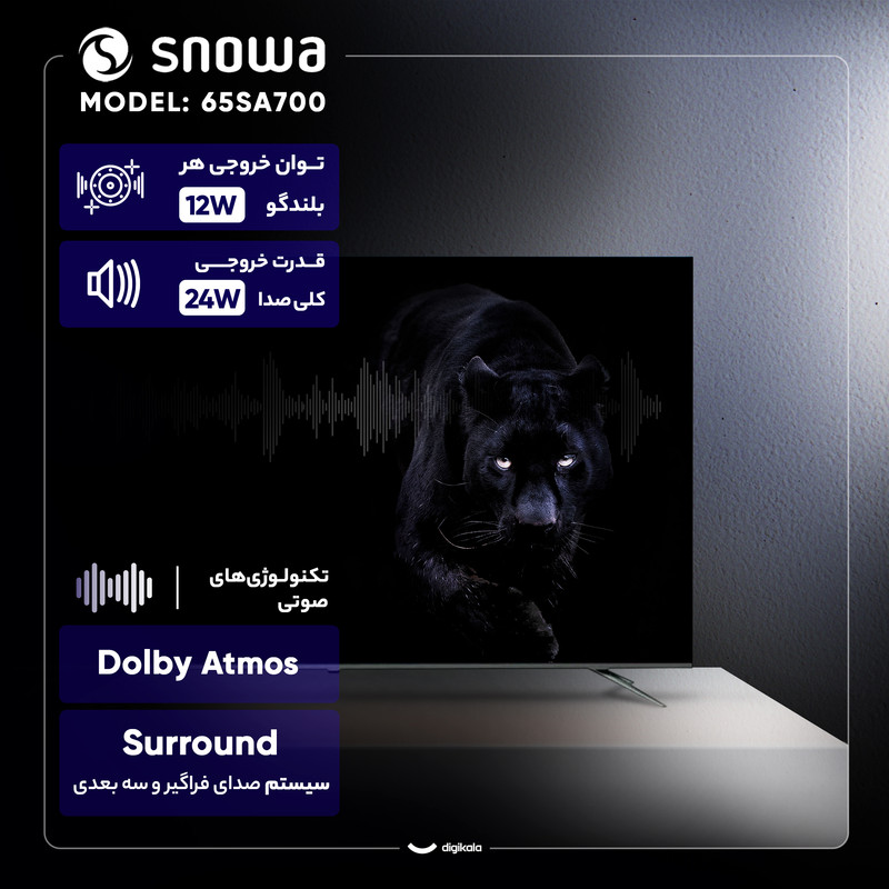 تلویزیون ۶۵ اینچ الایدی هوشمند اسنوا مدل ۶۵SA700 یک دستگاه پیشرفته با طراحی صفحه نمایش تخت و کیفیت تصویر ۴K Ultra HD است. این تلویزیون با رزولوشن ۳۸۴۰ × ۲۱۶۰ پیکسل، تصویری فوقالعاده با جزئیات بالا ارائه میدهد و از فرمتهای پیشرفته HDR10 و Dolby Vision پشتیبانی میکند که کنتراست و طیف رنگی چشمگیری را به نمایش میگذارد. این مدل با تکنولوژی پنل IPS level، زاویه دید بسیار گسترده و دقت رنگی بالایی را تضمین میکند و مجهز به فناوری MEMC برای نمایش روانتر تصاویر سریع است. بخش هوشمند تلویزیون بر پایه سیستم عامل اندروید نسخه ۱۴.۰ کار میکند و با حافظه رم ۲ گیگابایت و حافظه داخلی ۱۶ گیگابایت، عملکرد سریع و بهروزرسانیهای مداوم را ممکن میسازد. سیستم صوتی دستگاه دارای توان خروجی ۲۴ وات است و از تکنولوژی Dolby Atmos برای ارائه صدای فراگیر و سهبعدی پشتیبانی میکند. از نظر ارتباطی، مجهز به ۴ درگاه HDMI، ۲ درگاه USB، خروجی اپتیکال و گیرنده دیجیتال داخلی DVB-T2 است. طراحی بدون حاشیه و پایههای دوشاخه، ظاهری مدرن به آن بخشیدهاند.
